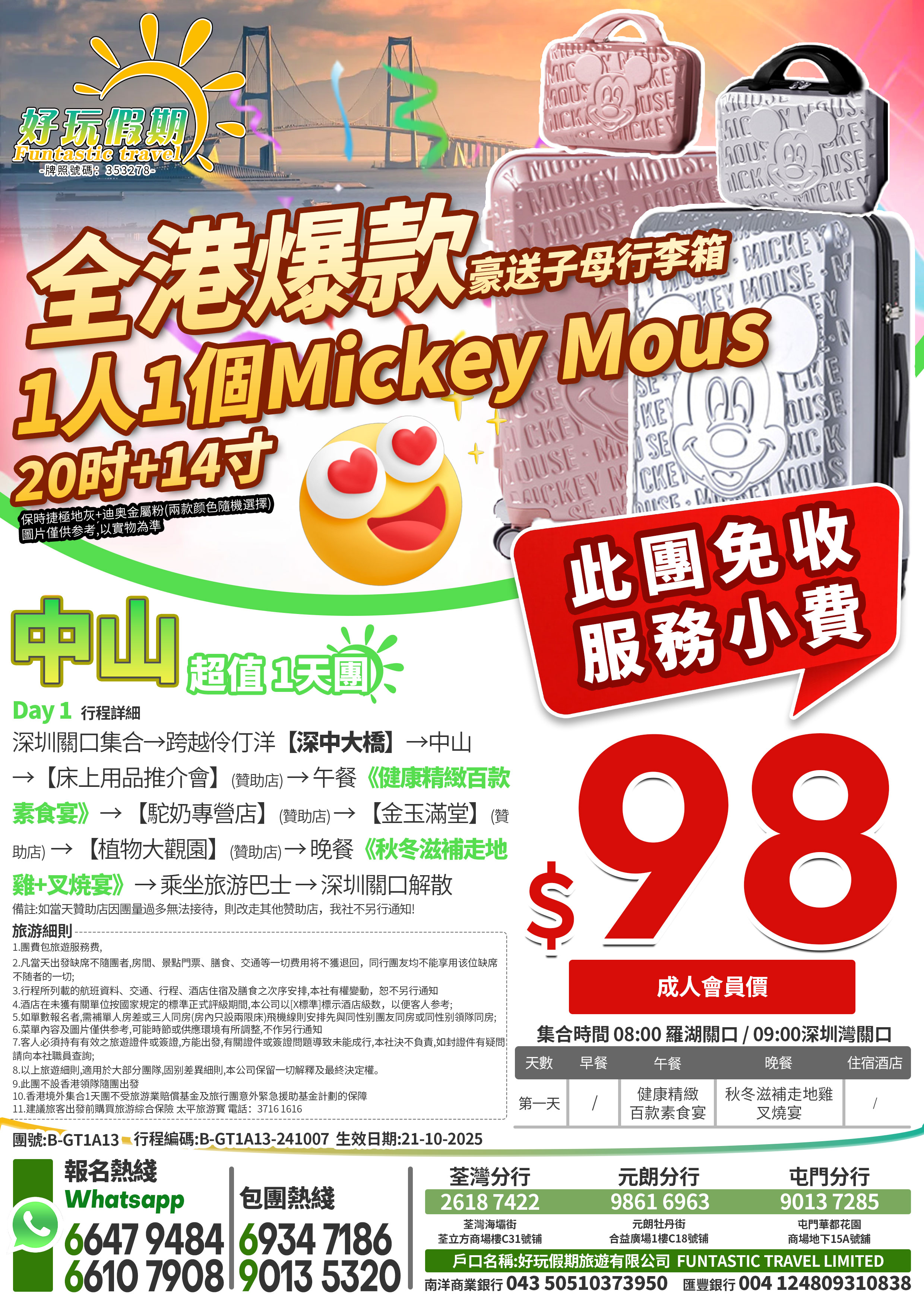 深圳關口集合→跨越伶仃洋【深中大橋】→中山→【床上用品推介會】→午餐《健康精緻百款素食宴》→【駝奶專營店】→【金玉滿堂】→【植物大觀園】→晚餐《秋冬滋補走地雞+叉燒宴》→乘坐旅遊巴士→深圳關口解散