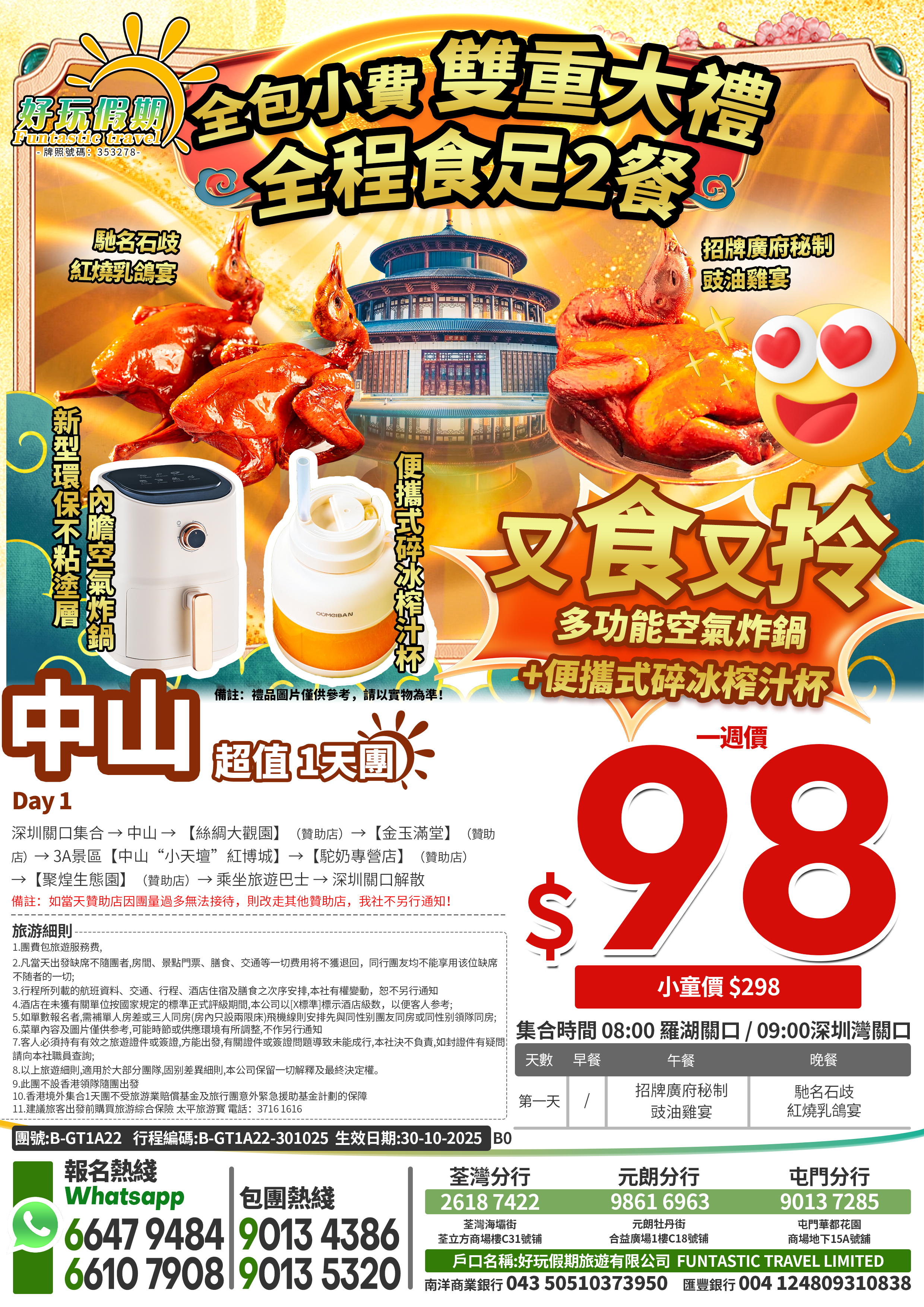 全包小費 雙重大禮:多功能空氣炸鍋+便攜式碎冰榨汁杯 全程食足2餐 超值抵玩1天