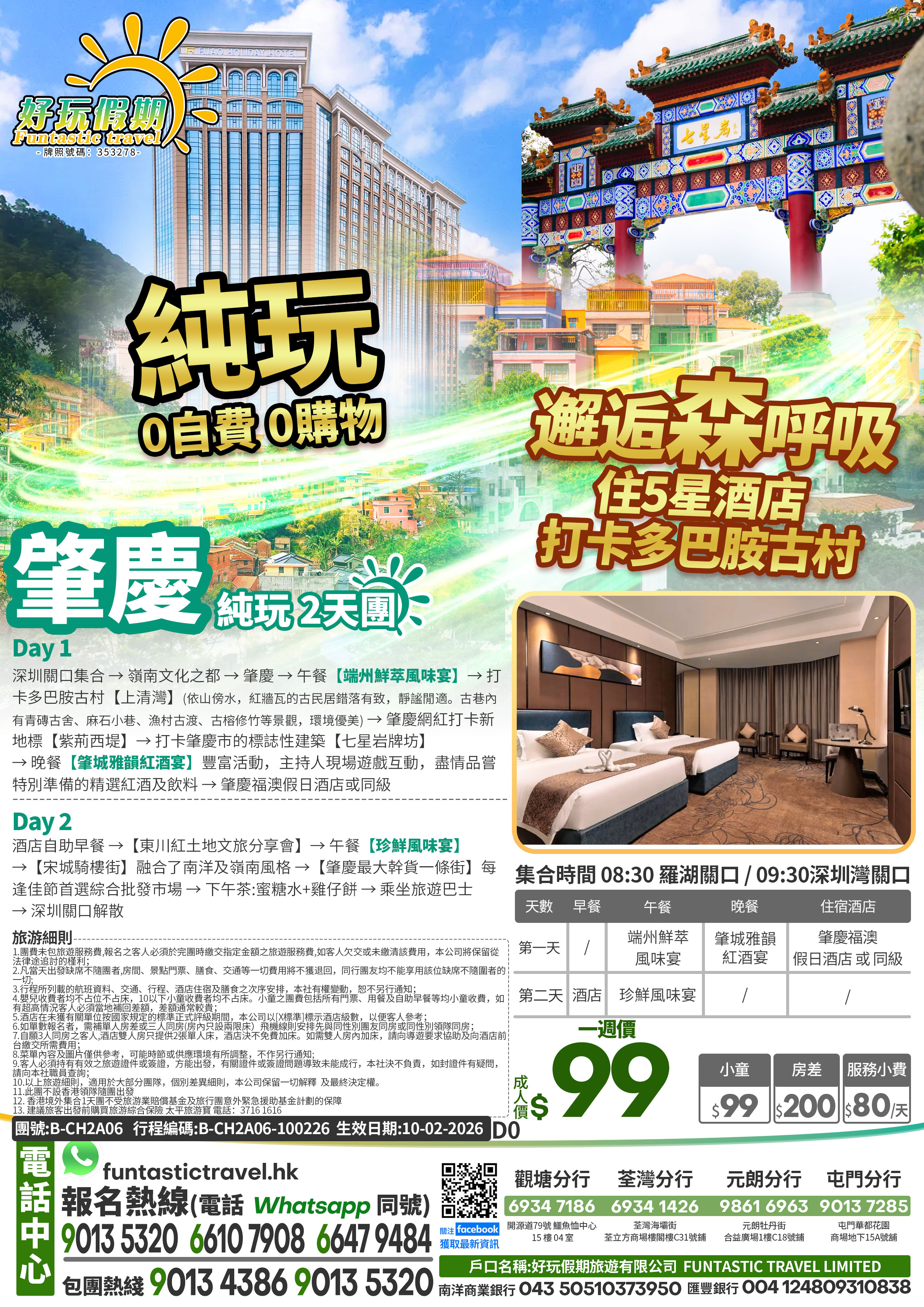 深圳關口集合→嶺南文化之都-肇慶→午餐【端州鮮萃風味宴】→打卡多巴胺古村【上清灣】(依山傍水,紅牆瓦的古民居錯落有致,靜謐閒適。古巷內有青磚古舍、麻石小巷、漁村古渡、古榕修竹等景觀,環境優美)→肇慶網紅打卡新地標【紫荊西堤】→打卡肇慶市的標誌性建築【七星岩牌坊】→晚餐【肇城雅韻紅酒宴】豐富活動,主持人現場遊戲互動,盡情品嘗特別準備的精選紅酒及飲料→入住當地五星標準福澳假日酒店或同級