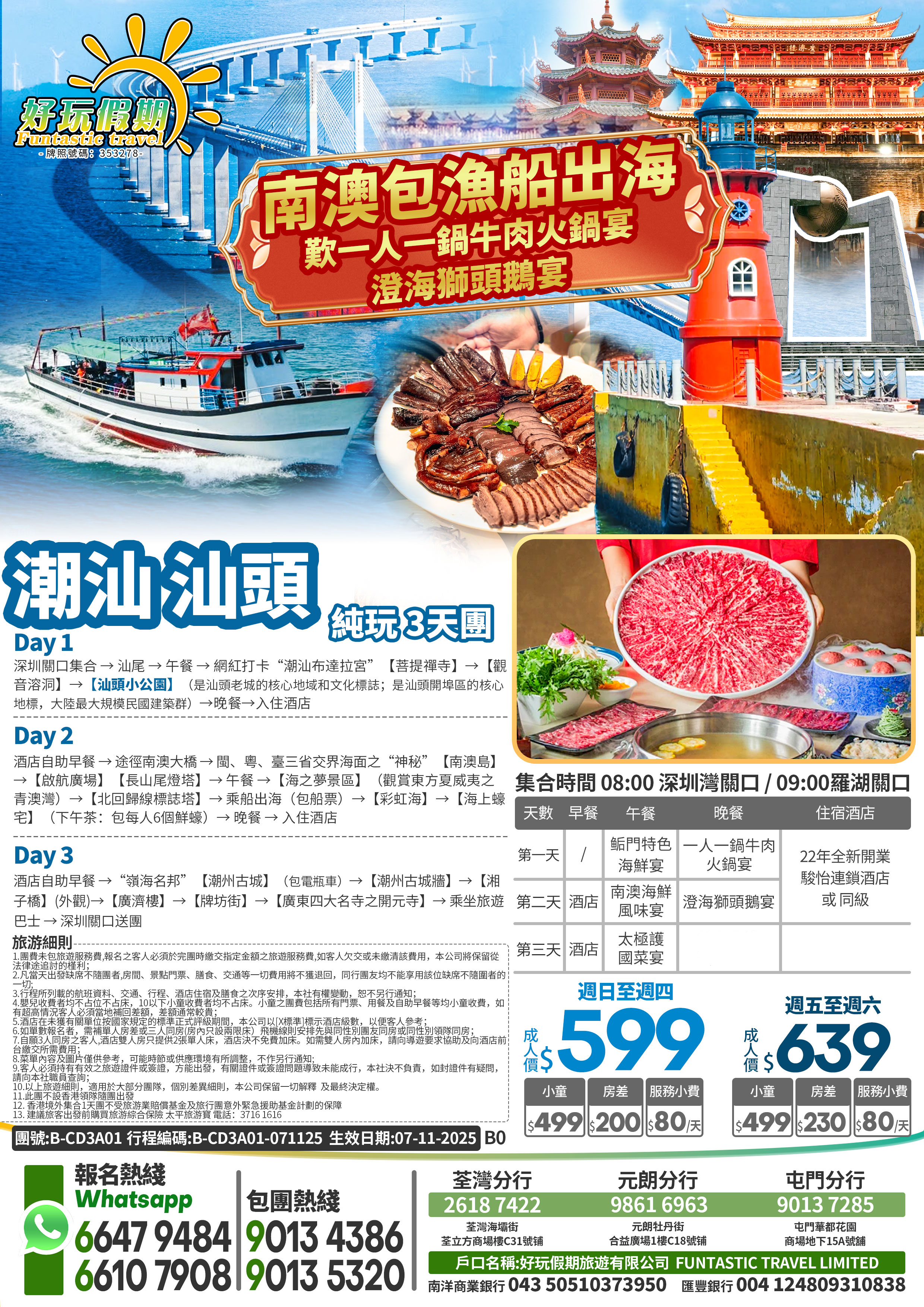 南澳(漁船出海)連住22年全新開業駿怡連鎖酒店 【一人一鍋牛肉火鍋宴】【澄海獅頭鵝宴】純玩巴士三天團