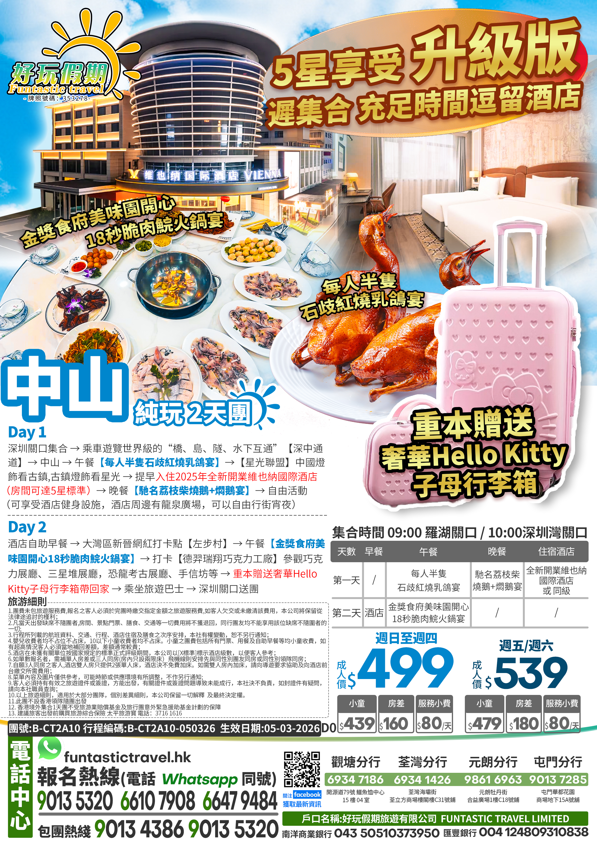 中山 經典三大美食推介 包每人一隻奢華子母行李箱 純玩2天