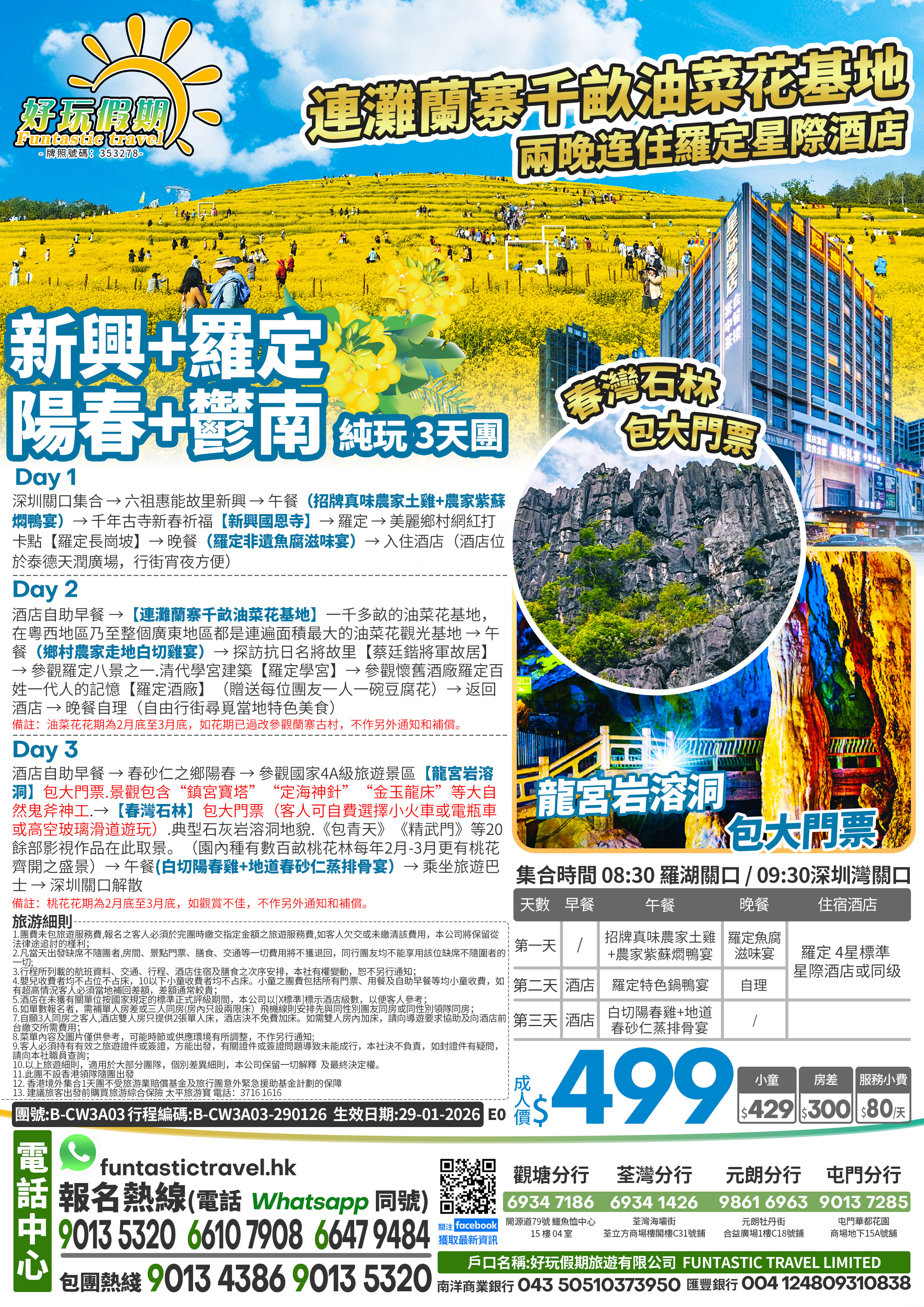 【連灘蘭寨千畝油菜花基地】+【春灣石林】+【新興國恩寺】+【羅定長崗坡】+新興+羅定+陽春+鬱南四城聯遊純玩3天團