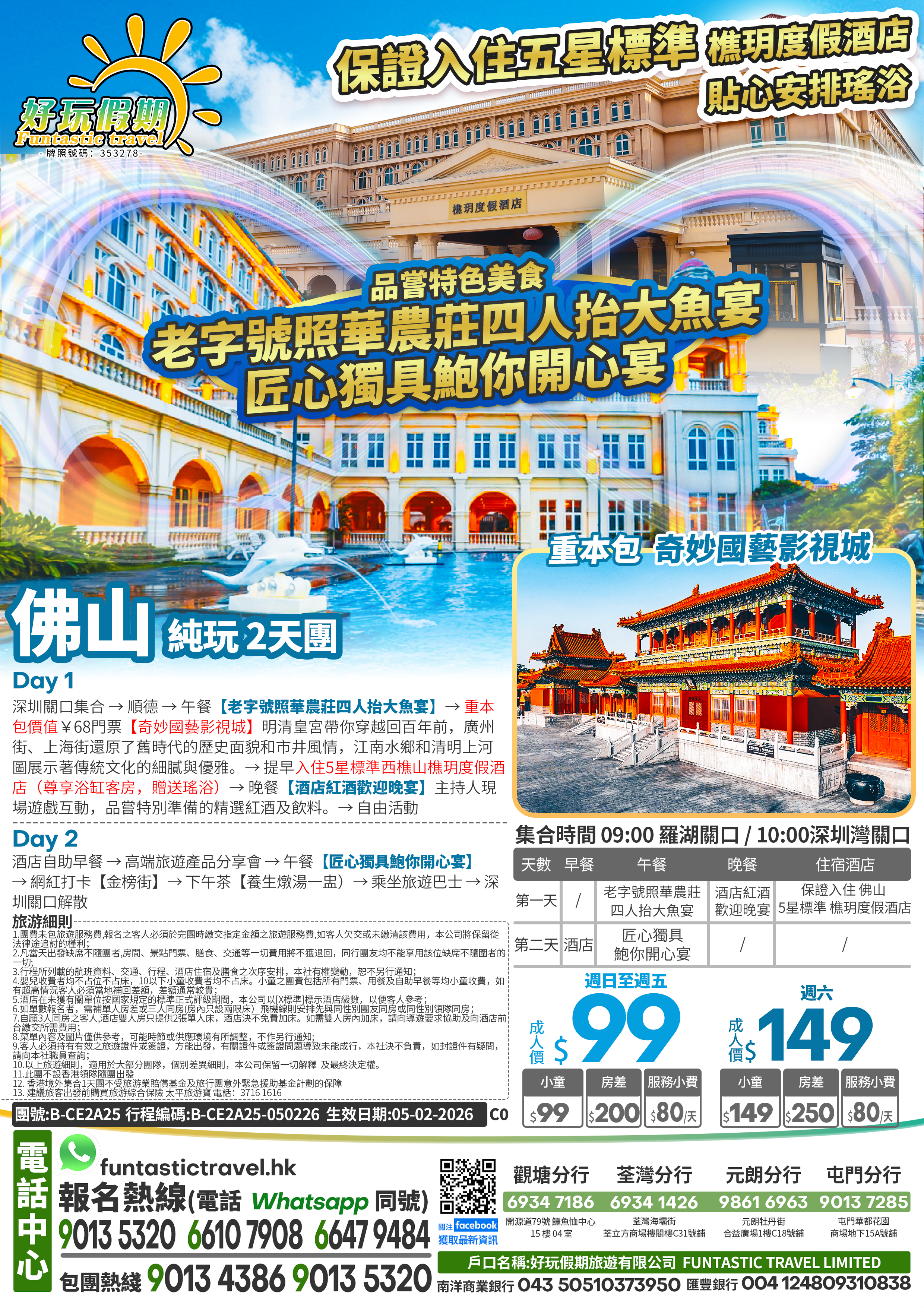 深圳關口集合→順德→午餐【老字號照華農莊四人抬大魚宴】→重本包價值¥68門票【奇妙國藝影視城】明清皇宮帶你穿越回百年前,廣州街、上海街還原了舊時代的歷史面貌和市井風情,江南水鄉和清明上河圖展示著傳統文化的細膩與優雅。→提早入住5星標準西樵山樵玥度假酒店(尊享浴缸客房,贈送瑤浴)→晚餐【酒店紅酒歡迎晚宴】主持人現場遊戲互動,品嘗特別準備的精選紅酒及飲料。→自由活動