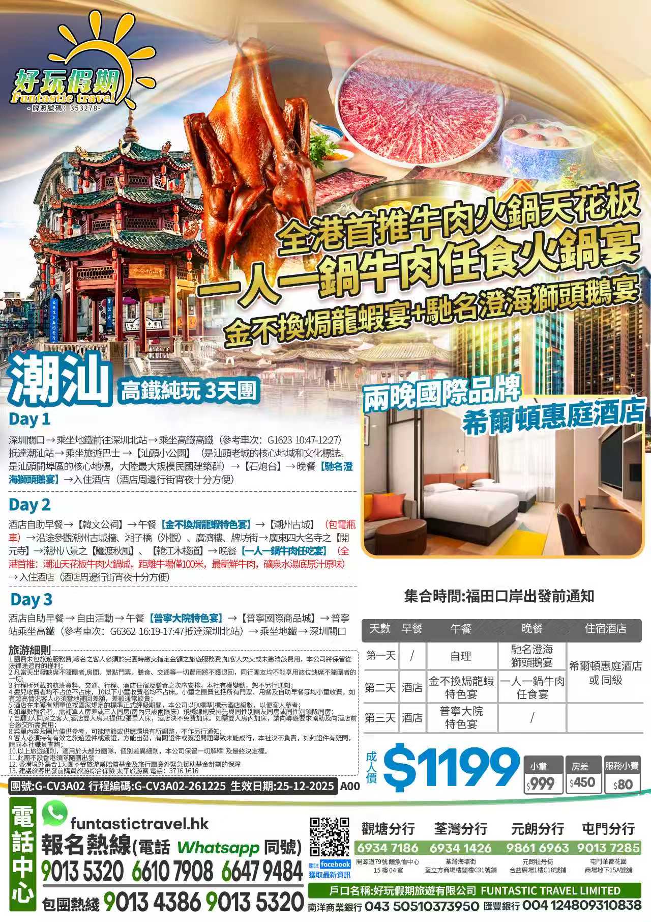 【全港首推牛肉火鍋天花板一人一鍋牛肉任食火鍋宴】高鐵純玩3天 兩晚國際品牌希爾頓惠庭酒店【金不換焗龍蝦宴】【馳名澄海獅頭鵝宴】