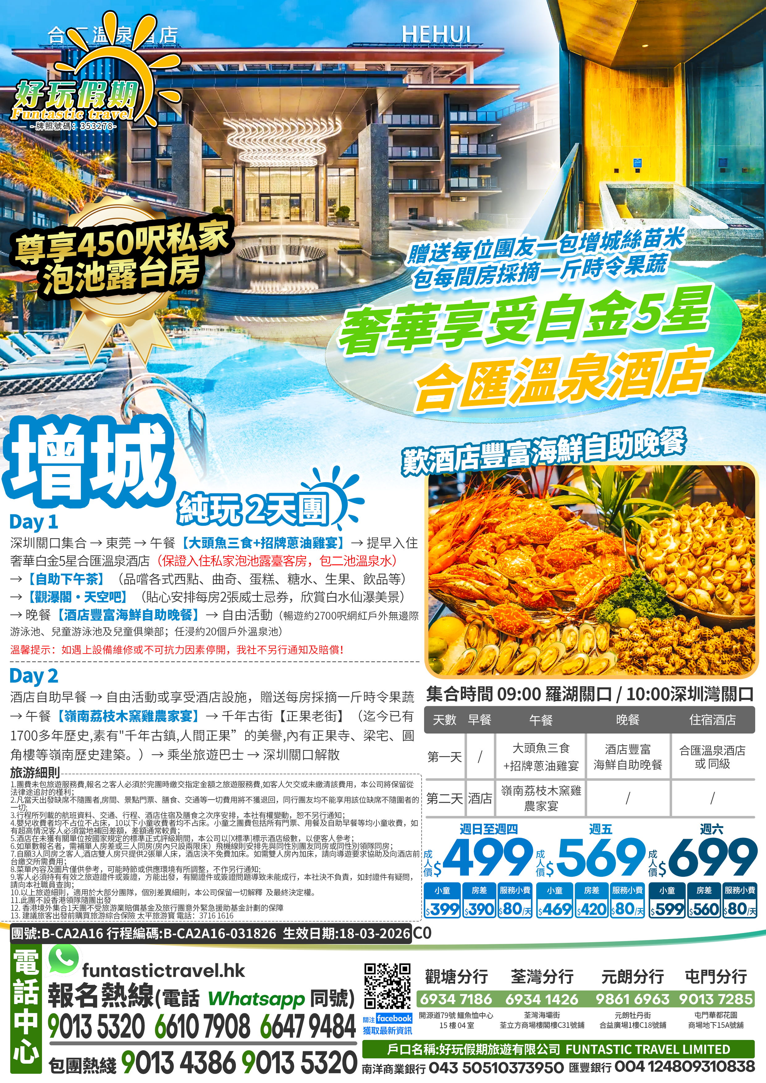 增城 白金5星合匯溫泉酒店 歎酒店豐富海鮮自助晚餐 獨立泡池房純玩2天