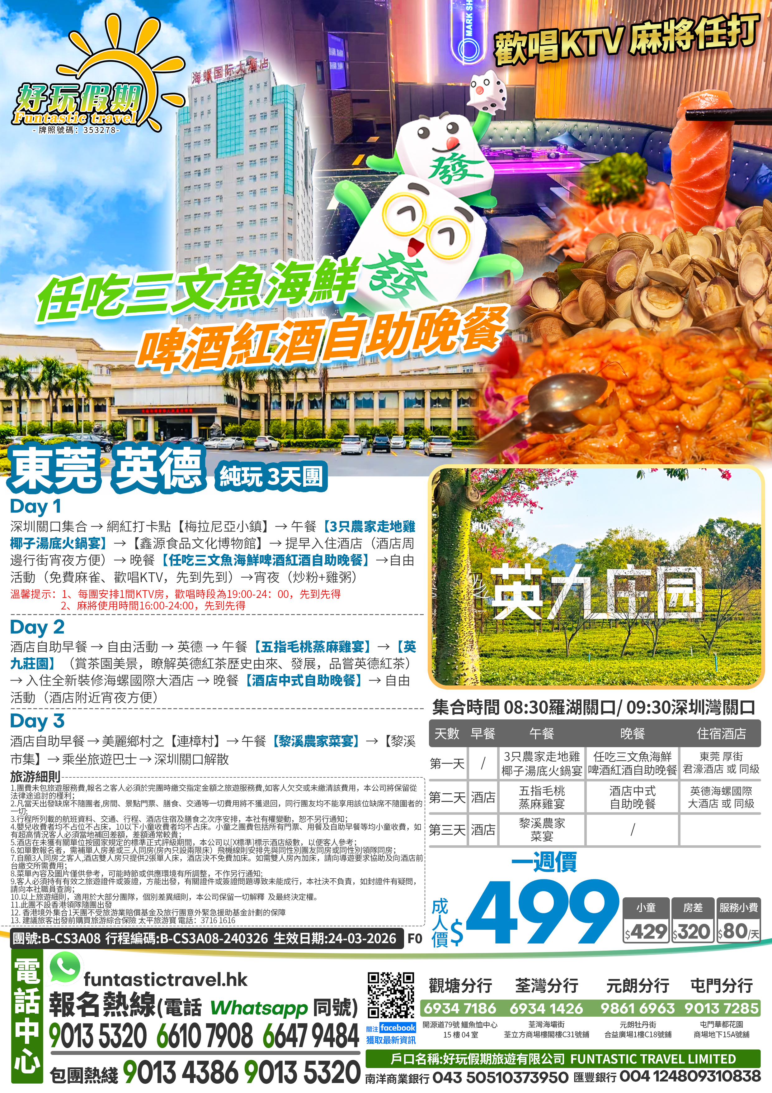 東莞+英德 歡唱KTV 免費麻將 任吃三文魚海鮮啤酒自助晚餐 純玩3天