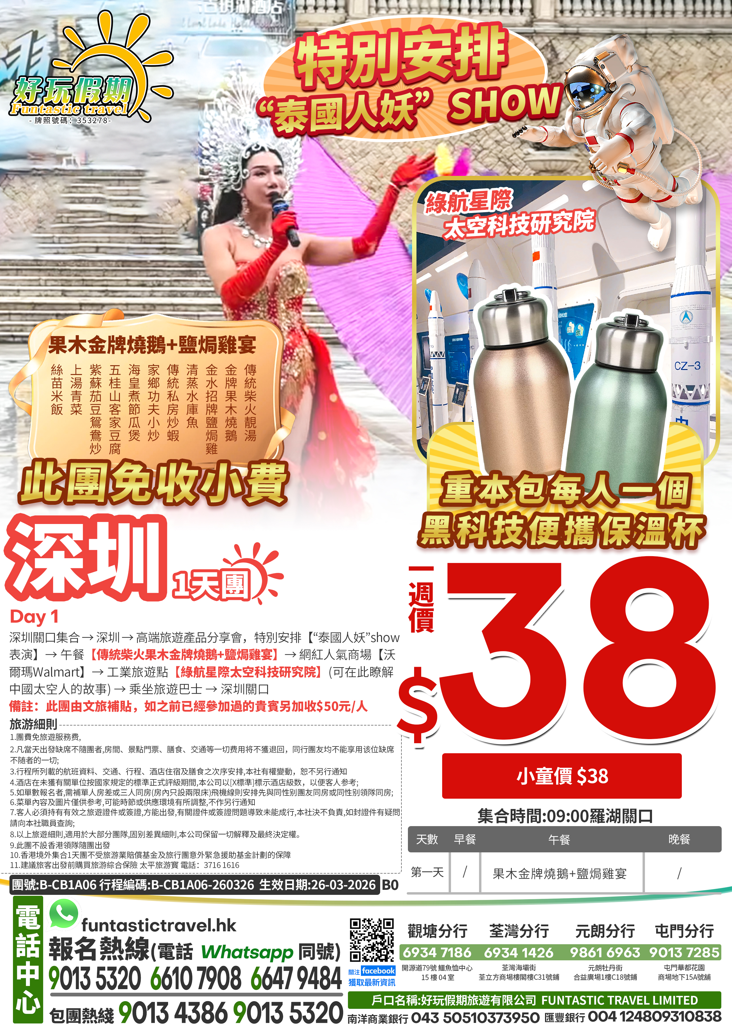 深圳關口集合→深圳→高端旅遊產品分享會(約2h),特別安排【泰國人妖show表演】→午餐【傳統柴火果木金牌燒鵝+鹽焗雞宴】→坪地網紅人氣商場【沃爾瑪Walmart】→工業旅遊點【綠航星際太空科技研究院】院名由中國飛天第一人英雄太空人楊利偉將軍題詞書寫→乘坐旅遊巴士→深圳關口